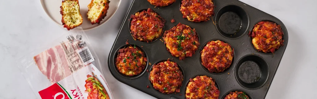 - Divide the batter evenly into the muffin tin, then sprinkle with reserved bacon and extra cheese